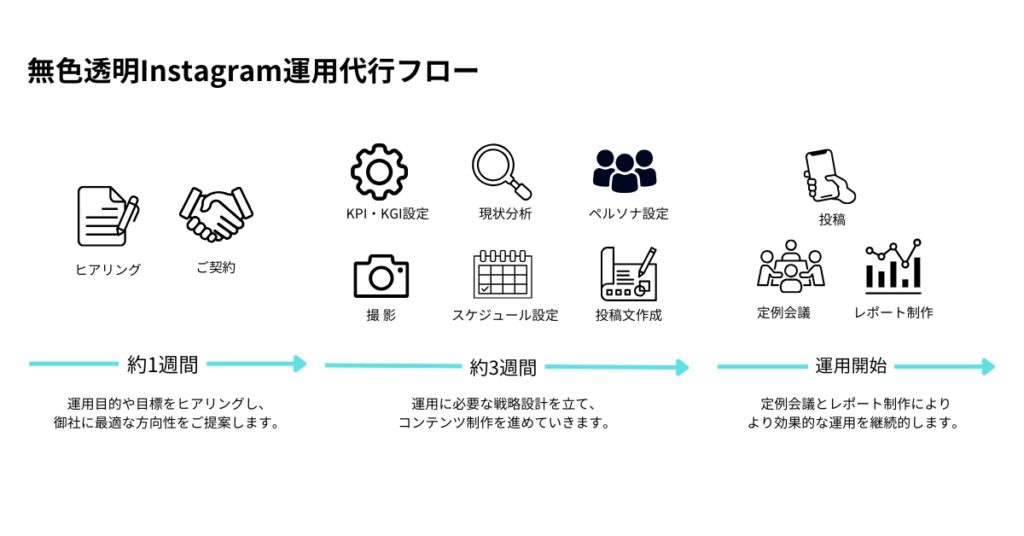 無色透明では、投稿内容の企画から投稿作業まではもちろん、毎月の運用結果のレポート作成と定期的な戦略会議、Instagram上のキャンペーンの企画や広告運用まで、Instagramを活用したマーケティングを幅広くサポートします。