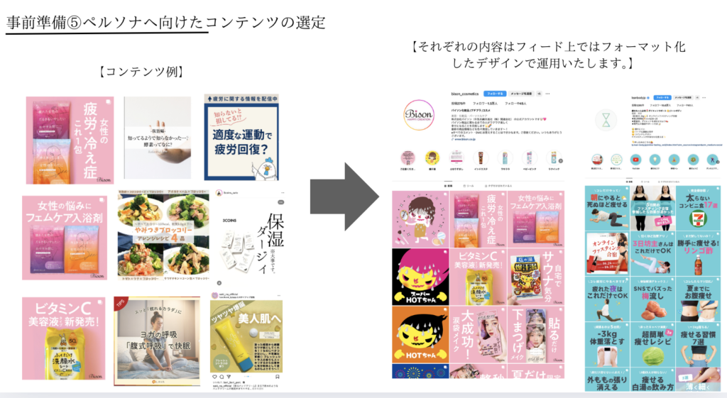 運用開始前には、的確なアカウント設計が重要となります。アカウントの現状分析や課題を言語化したあと、実際の商品・サービスの分析やペルソナ設定、実際のコンテンツ作成に進みます。
